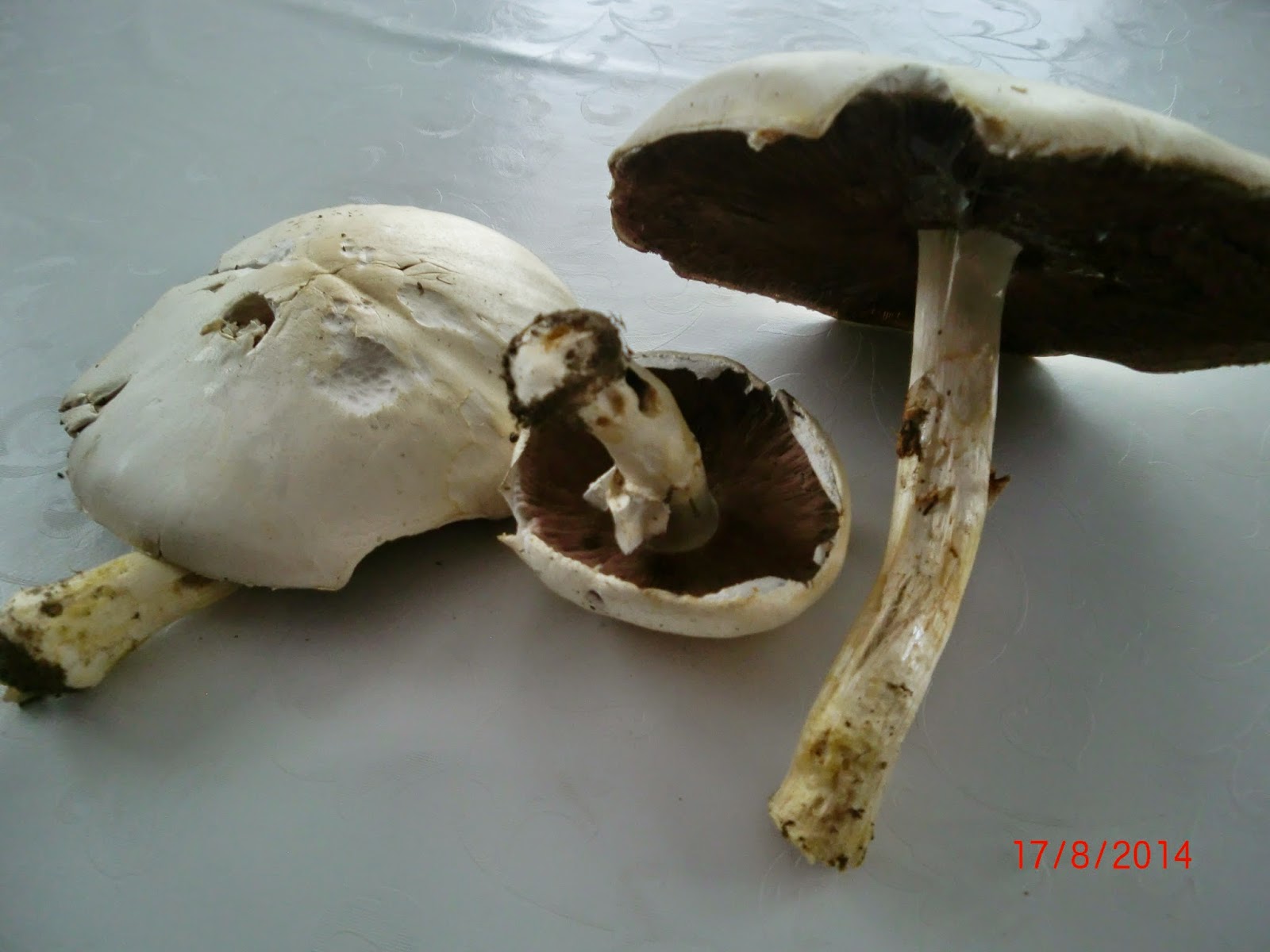 Wir laufen so auf dem Gehweg in Richtung Wald und plötzlich stehen da einige herrlich große Wiesenchampignons im Gras. Ich hab natürlich schnell geprüft, ob es auch keine Verwechslung mit dem Karbolegerling ist oder vielleicht gar mit dem Knollenblätterpilz aber nichts dergleichen, es waren Wiesenchampignons.